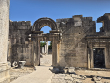 לאחר עיקול, נגיע לחניון מטיילים בין תל קדש לתל קדש המזרחי, בתחומי גן לאומי תל קדש. ניתן לצאת מכאן לטיול רגלי קצר (בשביל סלול המתאים גם לנכים) לעבר מקדש רומי מפואר (היחיד מסוגו בישראל) וסרקופגים עתיקים. גורמים חסרי בינה מתעקשים שמדובר על קברותיהם של דבורה הנביאה וברק בן-אבינועם, למרות שמקובל על החוקרים כיום שקדש נפתלי המקראית נמצאת בגליל התחתון המזרחי, בקרבת אזור הקרב הסמוך להר תבור.