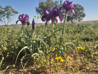 מכאן נשוב לדרך השדות ונמשיך מערבה. לאחר כ-620 מ' מתעקלת הדרך מצפון-מערב לדרום-מערב ולאורכה אקליפטוסים רבים. לאחר כ- 3.5 ק"מ נגיע לשדה לא מעובד לצד הדרך (קצת ממזרח לו, נראה מדרום לדרך מתקן פוטו-וולטאי גדול, בשטח כ-1350 דונם, הנחשב לאחד הגדולים מסוגו בישראל),, ובמרחק כ- 300 מ' נוספים הדרך מתעקלת ימינה בצורה חדה סביב שדה לא מעובד נוסף. בנקודת הפנייה, ניתן להמשיך ישר ולהגיע לחניון מטיילים קטן לצד אתר פריחה של אירוס הנגב ומינים נוספים כגון מצילות שנהב.